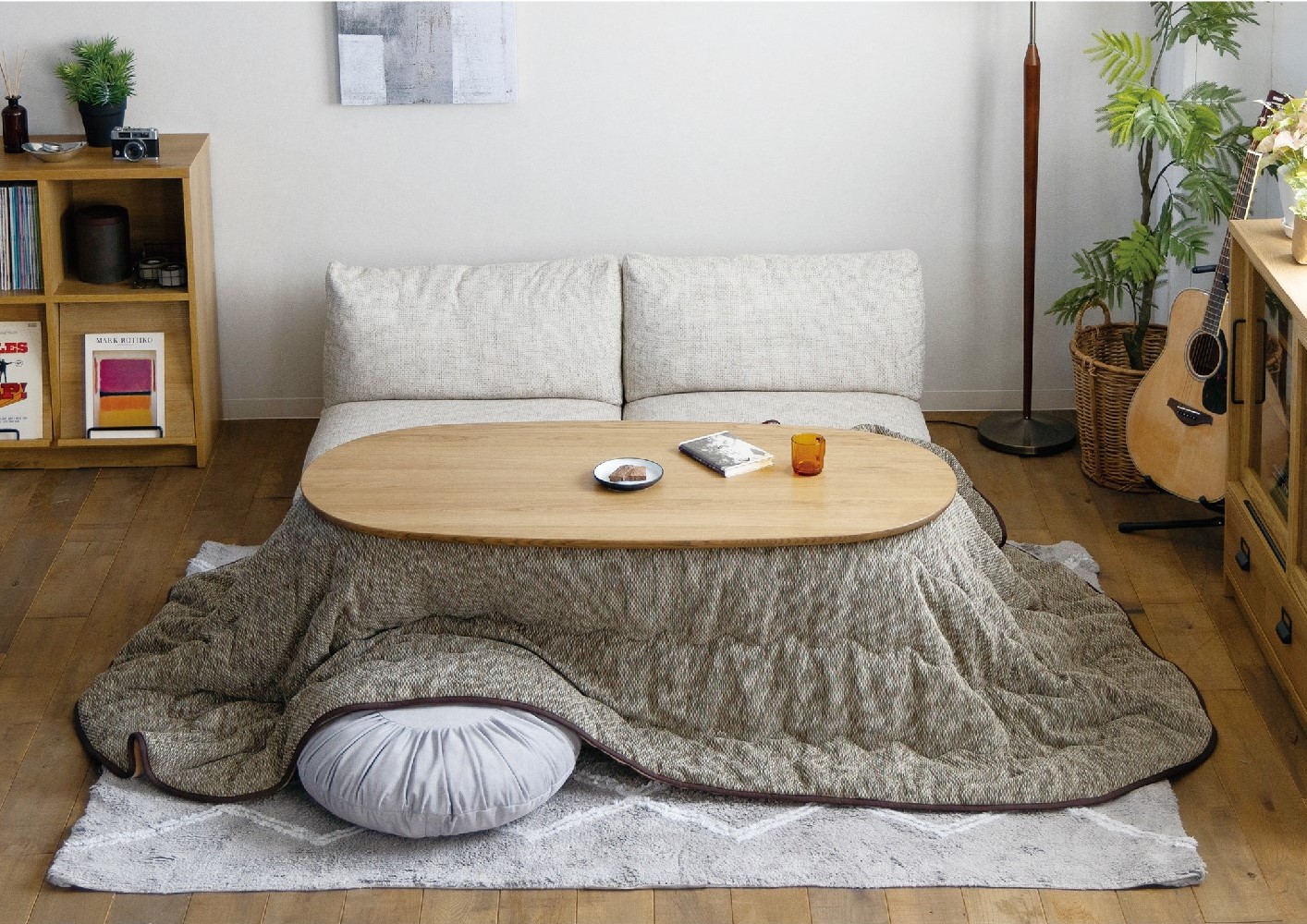 布団を外せばコーヒーテーブルとしても使え、座椅子やローソファなどと合わせた時の使いやすさを考慮した、
